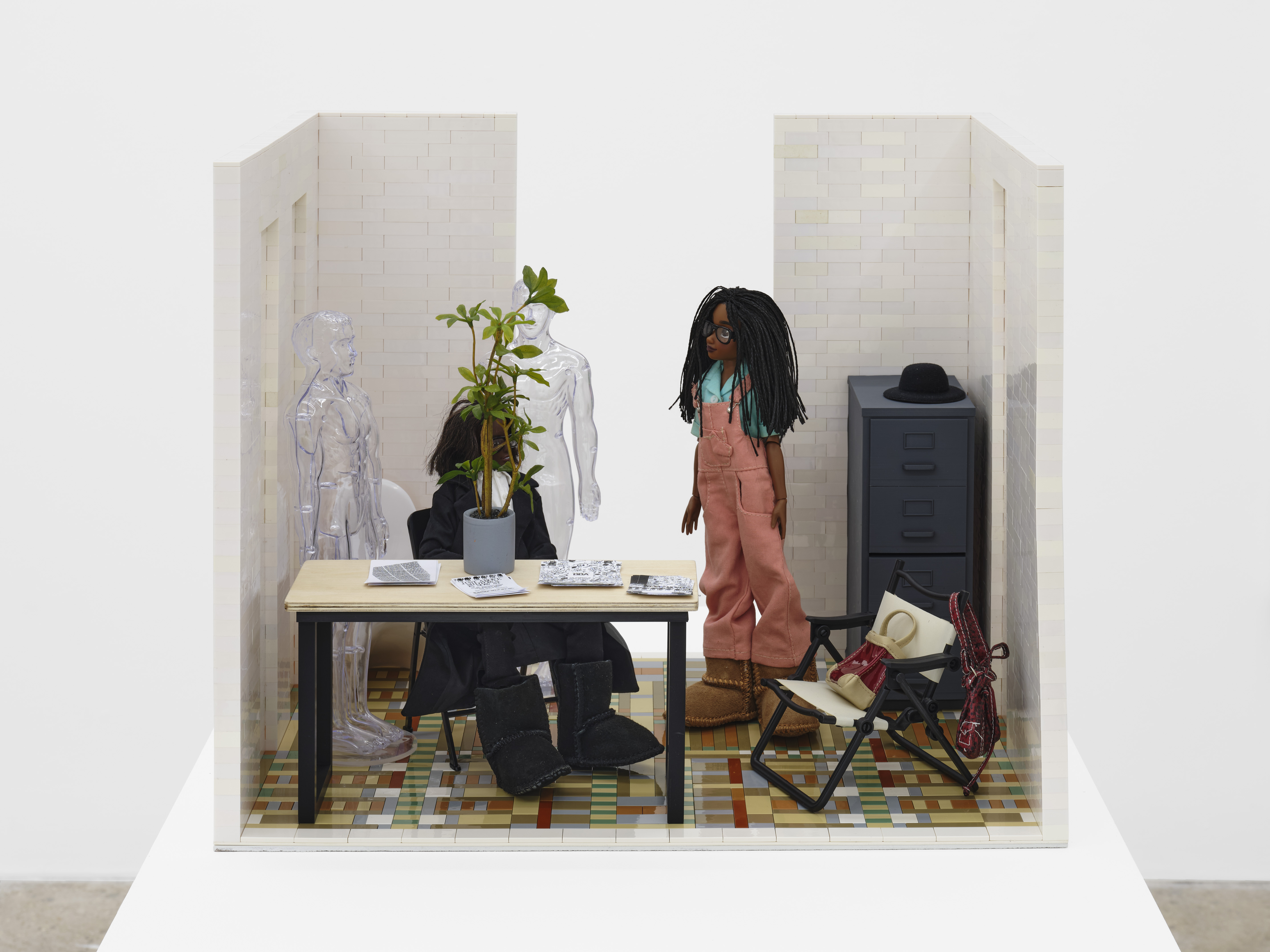 Works such as The Studio Visit (1983) and Cynthia and Janet at JAM on 57th Street (2024) illustrate Henry’s practice of using dolls and miniature constructions as stand-ins for herself, peers, and curators. In The Studio Visit, a Black doll represents Henry while a white doll depicts a visiting curator. In Cynthia and Janet at JAM, two black dolls stand in for Henry and her longtime friend Cynthia Hawkins, arranged among office furniture and transparent plastic figures within a Lego-constructed room. These dioramas enact scenes of professional and personal exchange, memorialize key moments of friendship, and underscore JAM’s importance as a space of creative freedom and community, situating Henry’s work within a broader history of Black cultural production.
